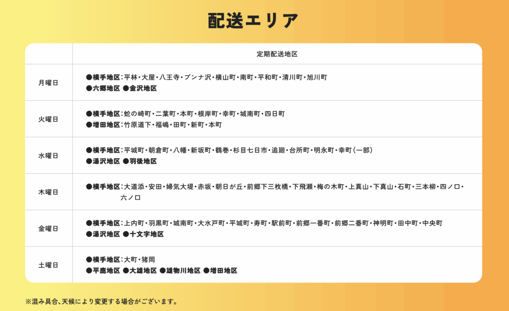 ※悪天候、道路状況により定期配送のルートを変更させていただく場合もございます。※冬季は大変込み合う為、お時間の指定は難しい場合もございます。今シーズンもご理解とご協力のほど、よろしくお願いいたします。